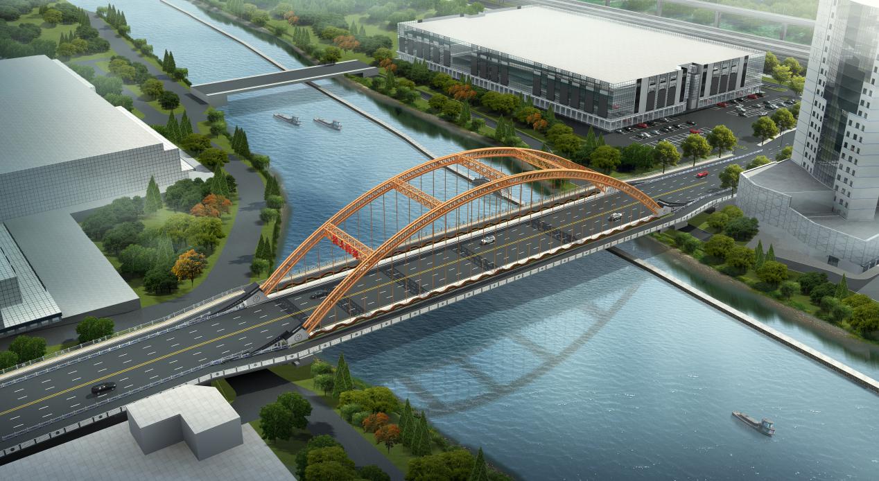金柯橋大道104國道口輕紡城大橋改建工程范圍南起104 國道,北至萬商路,全長552.38m,采用雙向六車道城市主干路標(biāo)準(zhǔn),設(shè)計速度50km/h,總投資約1.4億元。工程內(nèi)容包括新建一座跨越運河的鋼管砼系桿拱梁主橋,對現(xiàn)狀獨山地道進行入口改造,新建東升路地下人行通道聯(lián)通市場東西,大橋南北引橋下各建設(shè)一條下穿過路。